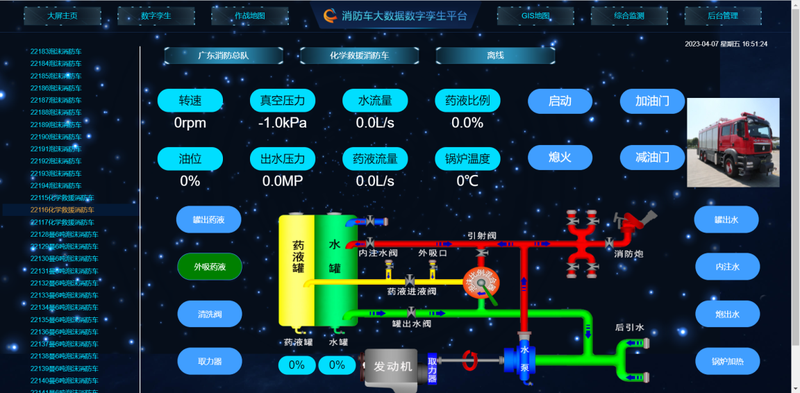 通过消防车信息管理模块,管理员可录入、修改和维护车辆基础资料;物联网数据采集模块支持终端数据实时接入,动态展示水位、水压、油量、位置等关键数据,并可查询历史记录。预警与告警模块实现阈值设定和实时告警推送,确保异常情况及时发现与处理。