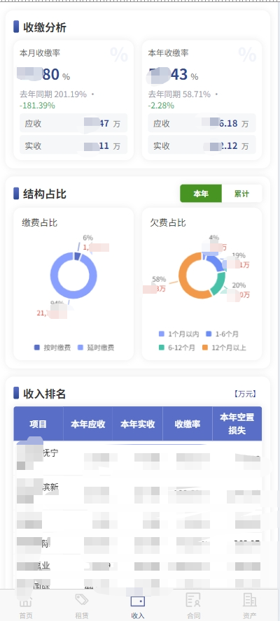 独立设计以及开发移动端业务页面样式以及代码逻辑,包括首页、租赁、收入、资产、项目详情等界面,封装支持多种slot自定义的移动端表格组件以及tab组件等。