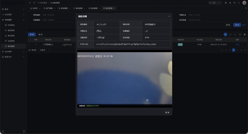 可对相机进行统一管理,包括相机名称、编码、所属企业、位置、使用状态、协议类型等。