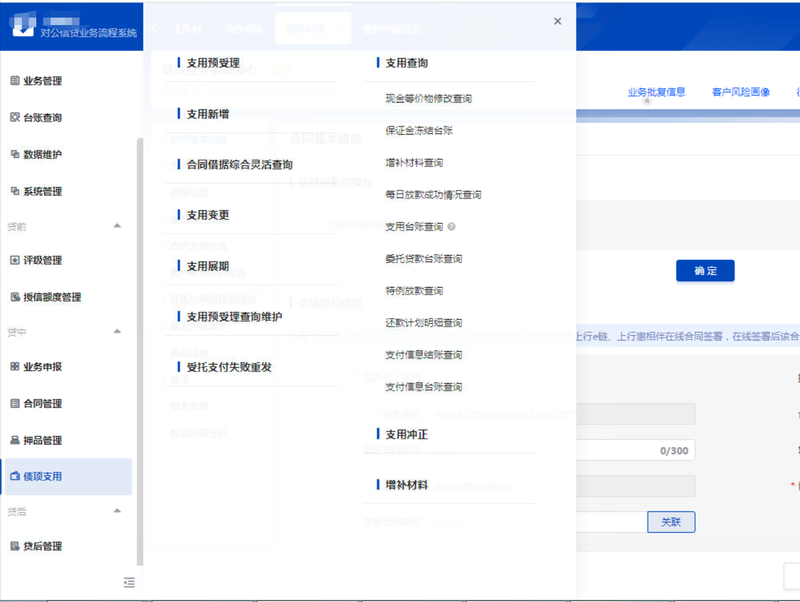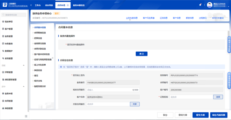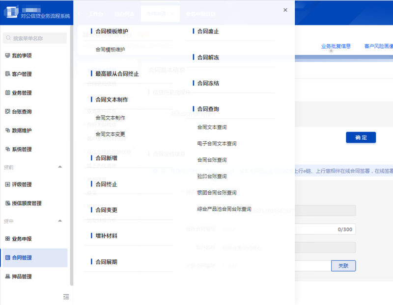 在银行对客户申请信贷业务完成审批,形成有效业务批复下。由客户申请签订信贷合同并提款为触发场景,对公客户经理在系统中创建综合授信协议、业务合同、放款申报方案,并落实签约/用款条件,经相关责任部门审核,最终在系统上生效合同信息或支用信息的全流程线上管理。包括新增、变更、废止、终止等操作场景。