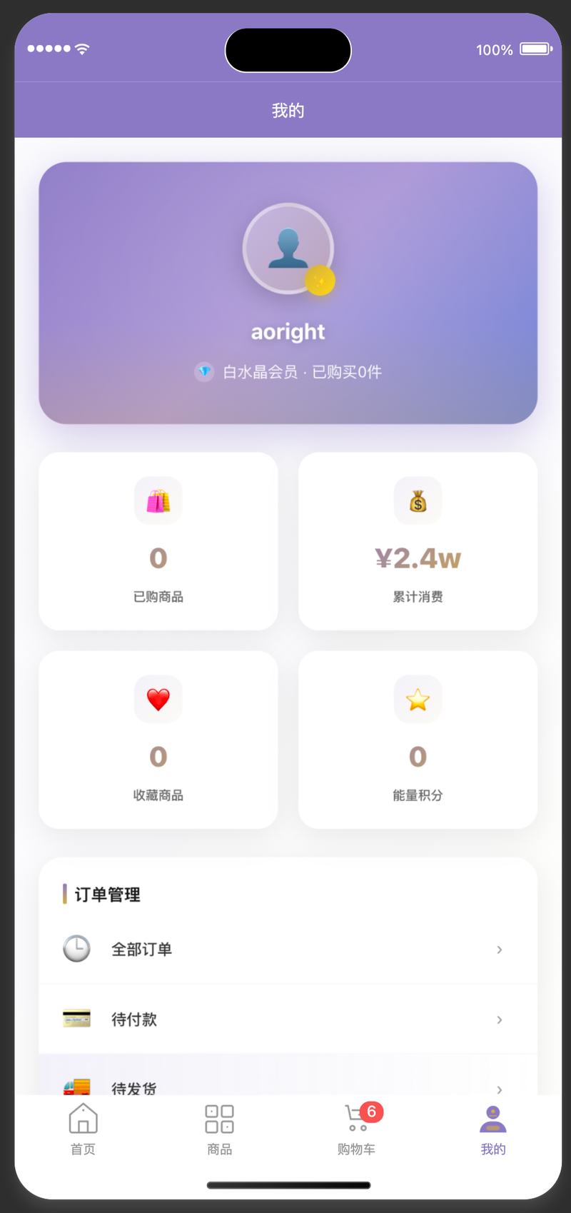 页面实现:按功能模块划分为首页、商品、购物车、订单、用户中心等多个模块