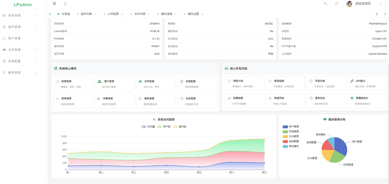 基于Laravel 10+PearAdminLayui构建的php后台管理系统。完整的用户账户管理,基于RBAC的权限管理系统,支持角色分配、权限控制、菜单管理等;灵活的系统配置管理、完整的操作日志记录、强大的文件上传管理、模块化组件系统等