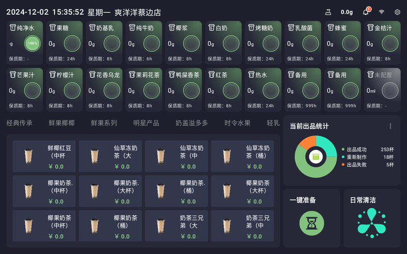 2. 奶茶机客户端:出品功能,清洗功能,在线升级,本地物料管理,每日出品统计