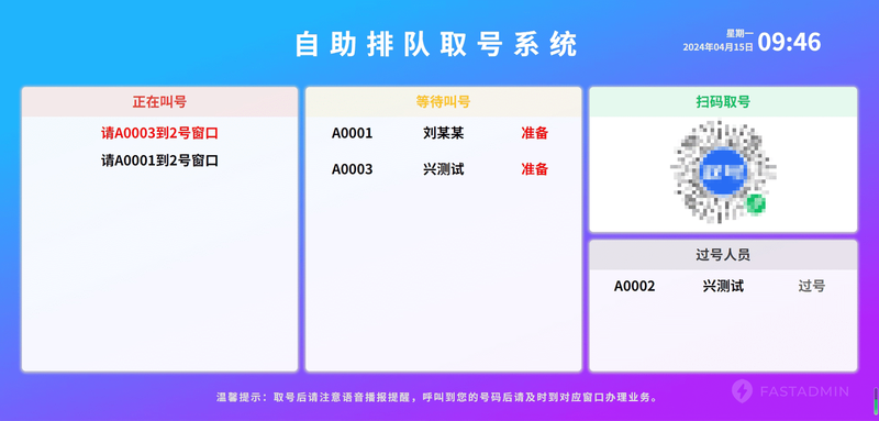 一款基于FastAdmin+GatewayWorker开发的多项目多场景排队叫号系统,支持大屏幕投屏,语音播报叫号,可用于餐厅排队取餐、美甲店排队取号、排队领取、排队就诊、排队办理业务等诸多场景,助你轻松应对各种排队取号叫号场景。