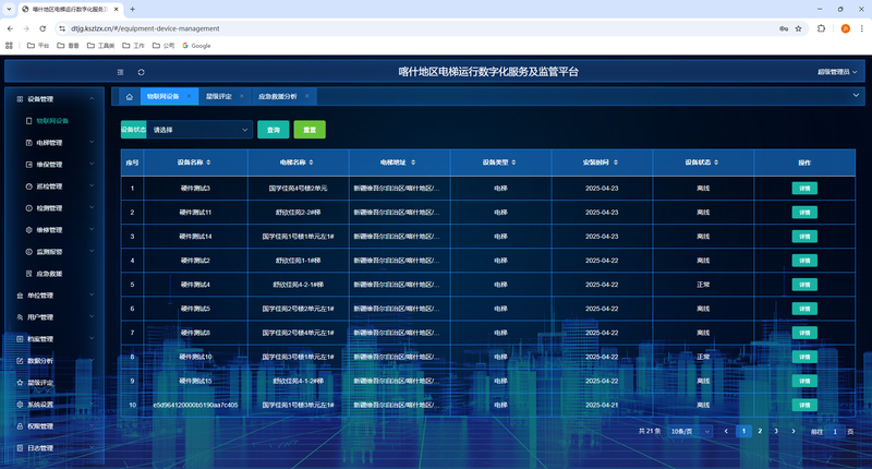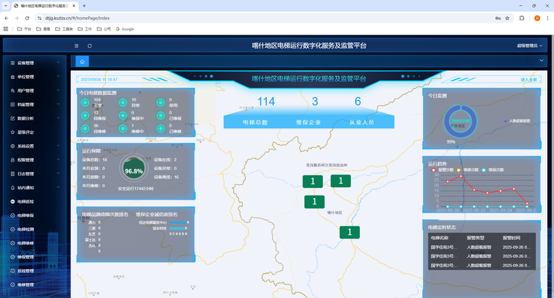 该项目是服务于新疆喀什地区的智慧城市重点项目,旨在通过物联网、人工智能和大数据技术,构建一个集实时监控、智能预警、应急调度、数据分析于一体的电梯安全综合监管平台。项目有效解决了传统电梯管理中的“监管难、救援慢、预防弱”等痛点,显著提升了电梯安全管理的智能化水平和行政效率。