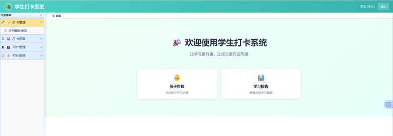 1项目主要功能有:家长可以进行注册,积分管理,打卡记录,用户管理;管理员可以有角色管理