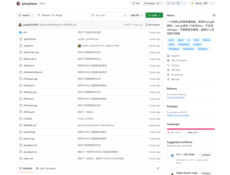 1、基于qt,qml,ffmpeg开发的音视频播放器,项目是2018年开发的,现在的水平已经远远超越了