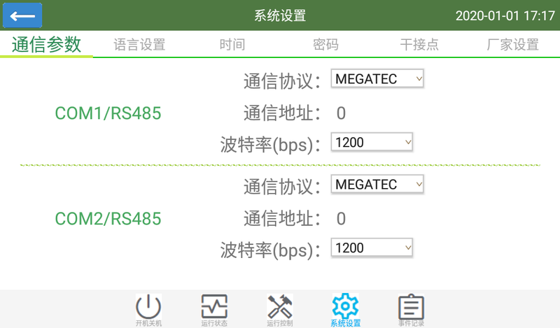 包括通信参数、语言设置、时间、密码、干接点、厂家设置。访问本界面受密码保护。