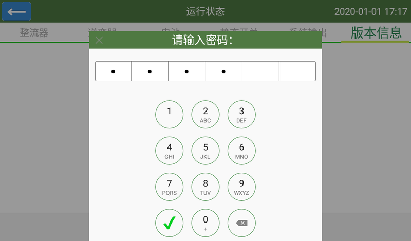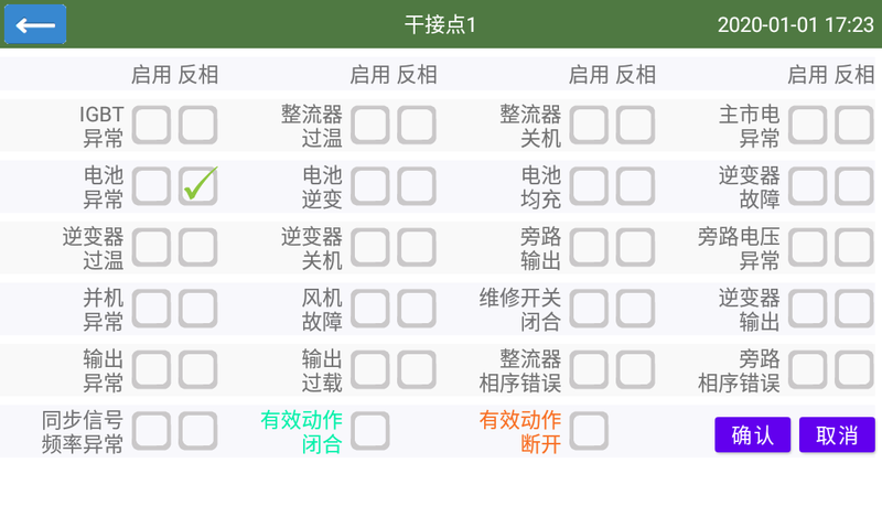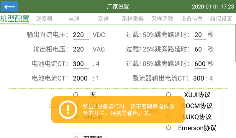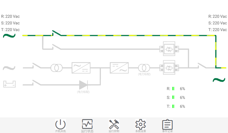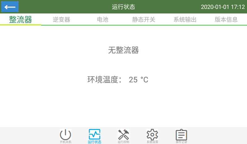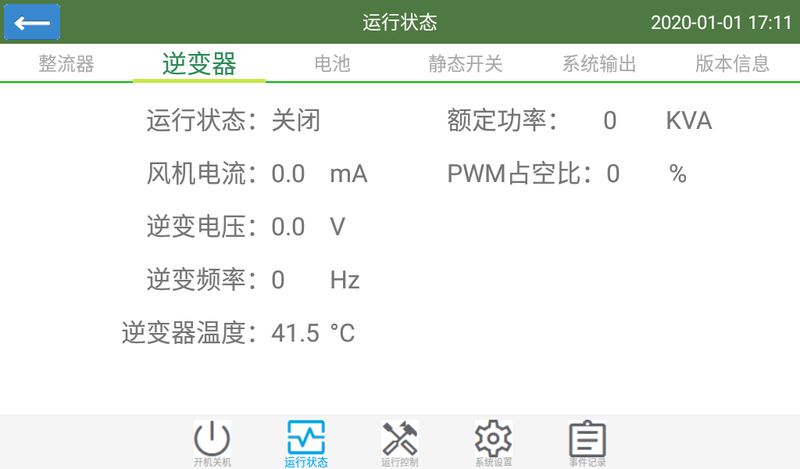 包括整流器、逆变器、电池、静态开关、系统输出、版本信息,共5个界面,包括众多参数。