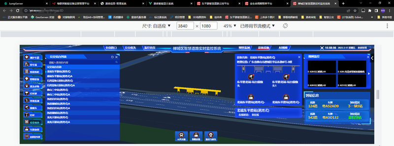 前台运用 Mapbox 对地图进行 3D 显示,可以对应路上真实的设备位置,点击设备时可查询当前设备的在线状态及其他属性,系统分为六大模块:全息路口(路灯状态监控。AI智能优化)、公交优先(各路口公交运行状态。智能优化调度优化前后对比信息展示)、监控首页(各模块信息概览)、预警监测(预警列表,预警处理步骤展示)、设备设施(路面设备展示)、AI视频(各路口监控视频)等。后台运维人员通过平台即可查看道路的实时数据与设备的联调。