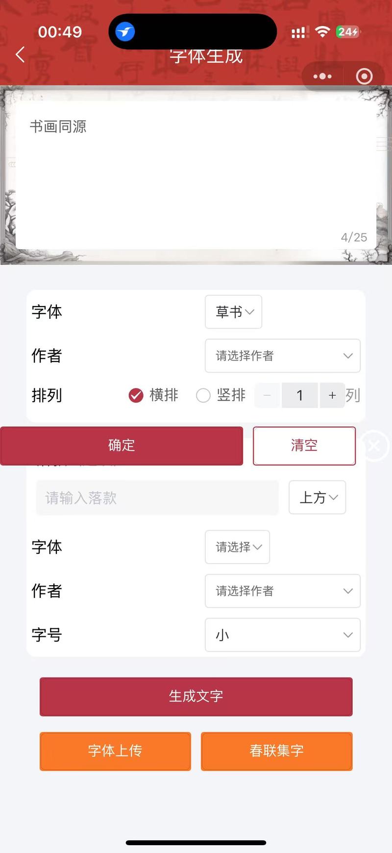 书法字库生成:用户可输入 500 字以内文字,选择字体、排列方式、字号及落款,生成专属书法作品,满足海报设计、贺卡制作等场景需求。