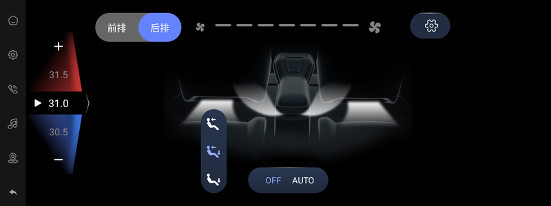 2. 支持主驾温度按钮设置或滑动;如果支持副驾温度设置的话,也要可以进行相应的设置;如果支持后排温度设置,也要显示相应的界面;