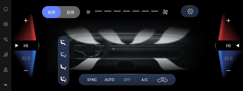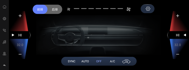 本系统属于汽车后装车载系统。本空调应用可以设置和显示空调温度、风力大小、风向、自动模式、内外循环、ECO、高效通风模式、A/C等。
