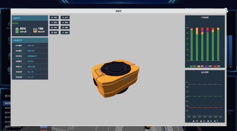 4、设备利用率,图表总览统计仓库设备运行效率,3D场景显示各设备的运作状态及信息等。