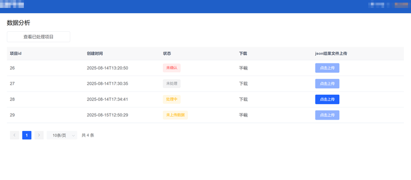 系统提供三大核心功能模块:用户权限管理、文件上传处理与分析结果管理。权限模块支持基于角色的访问控制,不同用户仅能操作其授权范围内的数据,保障信息隔离。文件上传功能允许用户提交符合规范的数据文件,系统在接收后自动触发后续处理流程,并记录操作日志。上传过程包含基础格式校验,确保数据合规性。分析结果管理模块在后台完成数据处理后,将结构化结果持久化存储,并在前端提供独立页面进行展示,内容包括关键指标摘要与可视化图表。用户可在此页面查看、核对结果,并支持以标准格式导出,便于归档或二次使用。此外,系统保留完整的操作轨迹,支持按项目或时间维度追溯数据生命周期,为审计与复盘提供依据。所有功能均围绕“上传—处理—展示—归档”主线设计,流程清晰,界面简洁。