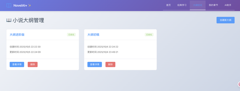 2、根据自己的小说大纲初稿让大模型输出完整的大纲,可以编辑修改重复调整 后保存