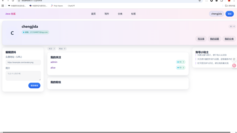 用户模块:注册/登录、JWT鉴权、资料编辑、邮箱验证码、关注/粉丝统计与列表。