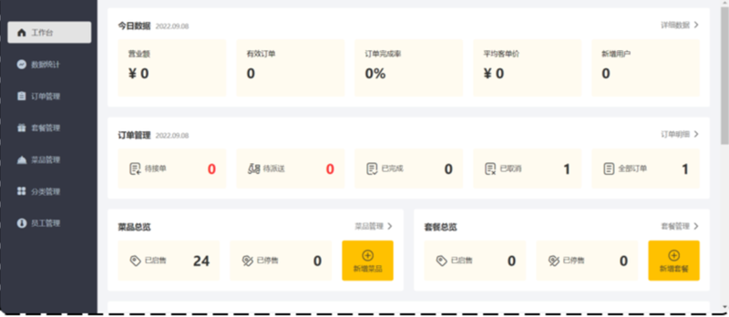 员工登录/退出 , 员工信息管理 , 分类管理 , 菜品管理 , 套餐管理 , 菜品口味管理 , 订单管理 ,数据统计,来单提醒。