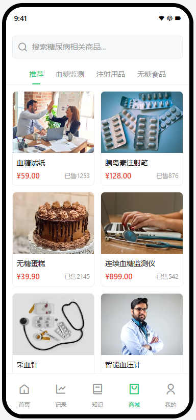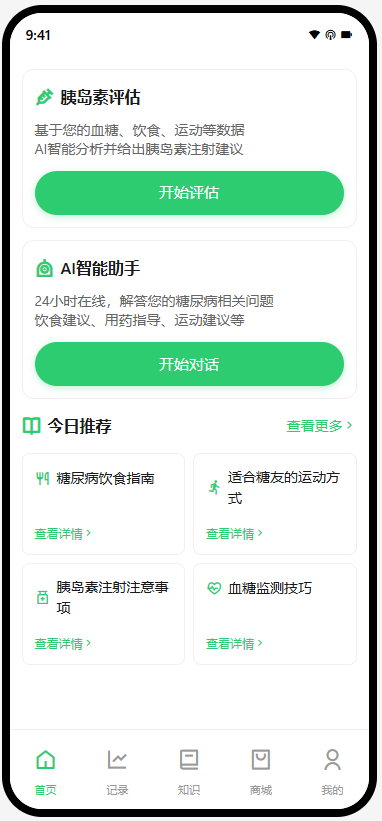 行业场景:面向慢病管理领域,为糖尿病患者提供AI智能评估、血糖数据追踪、饮食运动记录、治疗方案管理、知识科普及医疗用品购买等一站式服务,通过数字化手段提升患者自我管理能力,降低并发症风险。