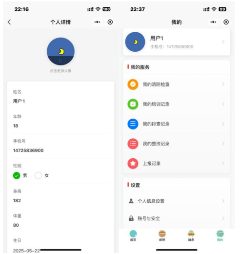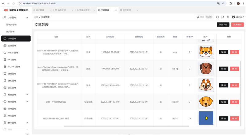 用户主要有登录注册、消防安全教育、消防安全隐患、消息通知、消防安全场所、个人中心 5 个模块,而消防安全教育和隐患排查又包括课程学习、设备学习、文章浏览、隐患检查、隐患上报5 个模块。管理员主要有登录注册、消防安全教育管理、消防安全隐患管理、消息管理、消防安全场所管理、个人管理 5 个模块,而消防安全教育管理与消防安全隐患管理又包括课程管理、设备管理、文章管理、隐患排查建议、隐患上报审察这 5 个模块