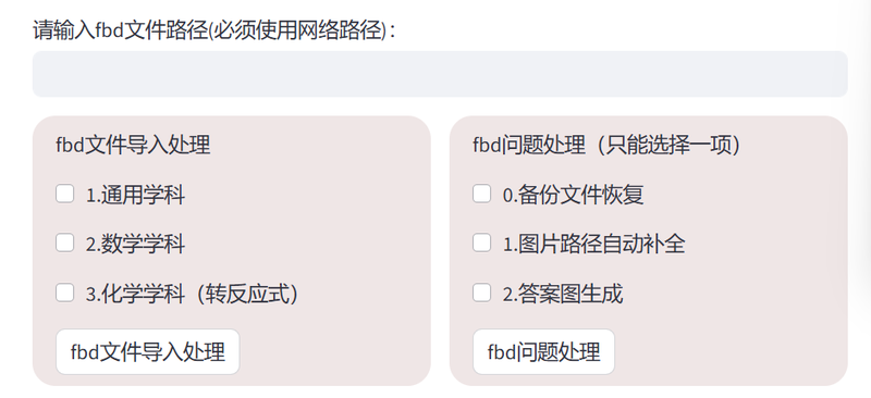 通过复选框选择需要的处理选项,点击对应按钮触发处理,处理完成后通过 toast 提示结果。