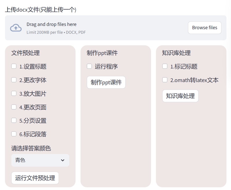用columns划分 3 列布局,分别展示 “文件预处理”“制作 ppt 课件”“知识库处理” 的复选框选项,用户可选择需要的处理功能;
