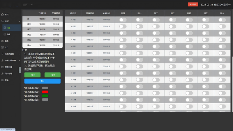 前端界面与交互开发:基于需求功能模块,使用 Vue3、Element Plus、ES6 开发 Web 端核心界面,包括空调定时控制面板(单个 / 批量定时规则配置、时间 / 模式参数设置界面)、加班申请与审批流程页(用户端申请表单、管理员端审批列表及详情页)、用户分级管理界面(角色权限配置、用户增删改查页面)、PLC 设备状态监控面板(实时通讯状态 / 温度数据可视化展示、异常报警弹窗)、水阀状态监测页(水阀列表、状态 / 位置实时展示及历史记录查询界面)。