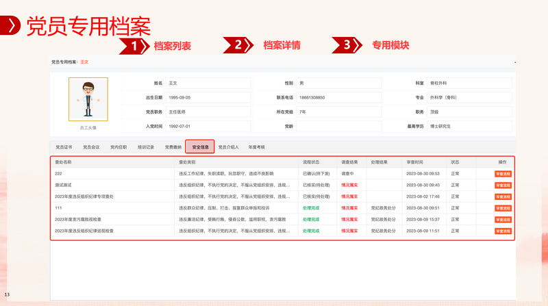 查看党员专用档案:包含基本信息、入党信息、党员证书、党员会议、党内职务、培训记录、党费记录、安全信息、介绍人、年度考核