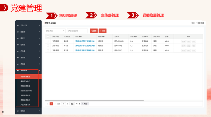 3.2组织部:组织部包含支部换届记录、三会一课审查、干部人才管理、高层次人才管理、党员管理