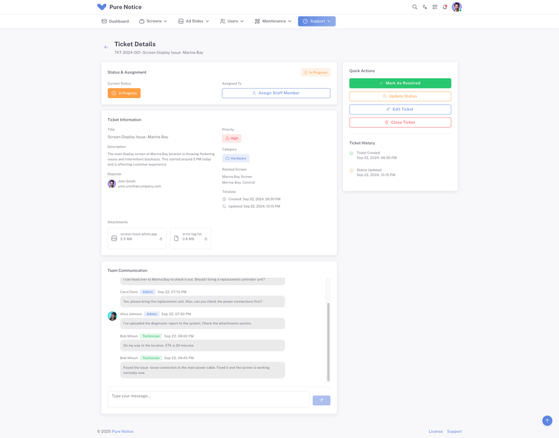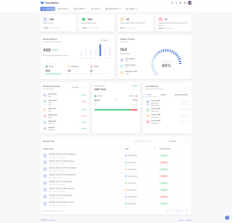用户可以监控数百个屏幕,分配维护任务,并以直观的方式跟踪性能表现——这一切都可在一个简洁且基于数据的仪表板中完成。