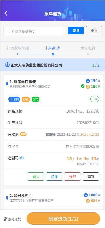 (7)药品退药,支持药单一键退药、多患者批量退药,多平台同步自动释放追溯码,不影响再次销售;