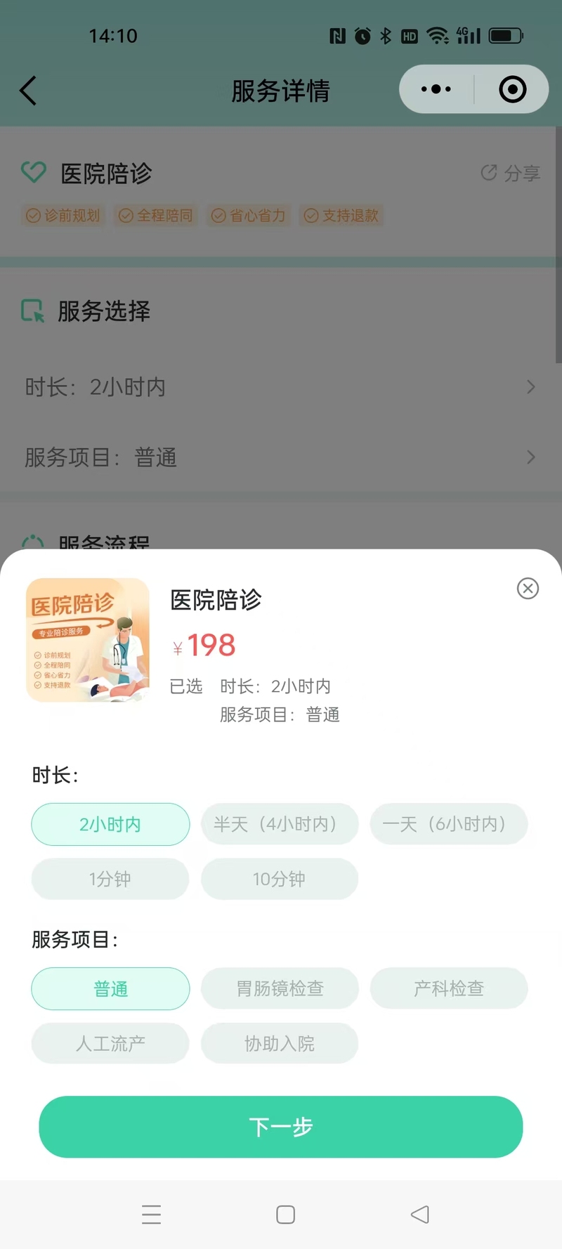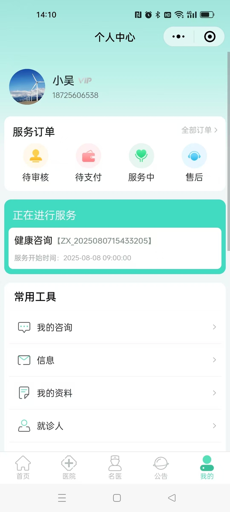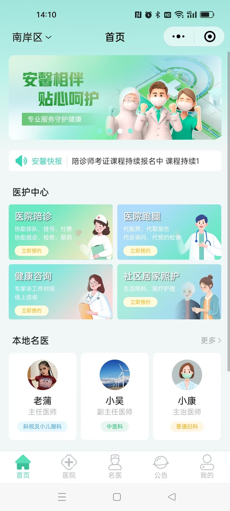 客户通过安馨陪护小程序,在线远程医疗问诊,及订购线下服务,包含跑腿、陪诊、居家照护等。