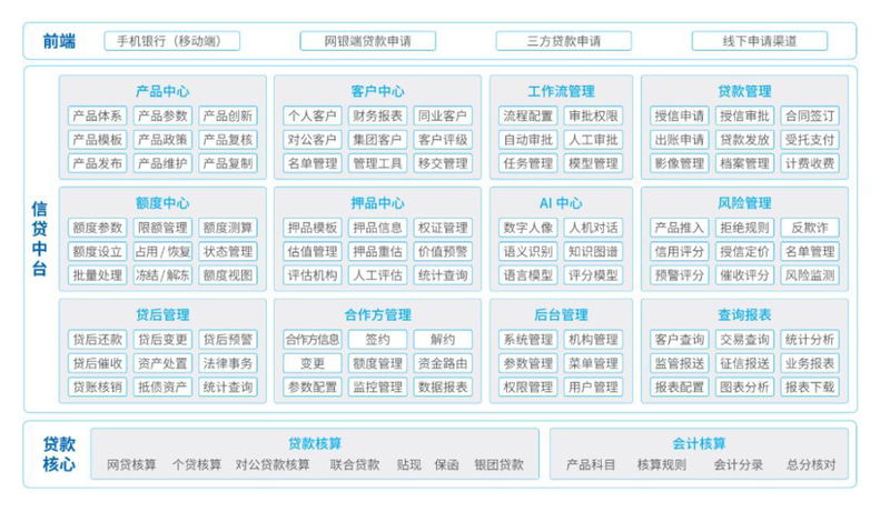 1. 基础功能:小程序端贷款申请(身份证 OCR 识别)、人脸识别、进度查询;管理端审批流程管理。