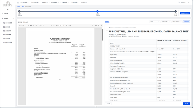 支持 PDF、图片等多格式上传,自动识别拆分财务报表,精准提取科目与金额数据。通过会计恒等式校验高亮异常项,内置多行业模板适配复杂版式,可生成多维度分析报告,最终导出 Excel、JSON 等格式对接业务系统。