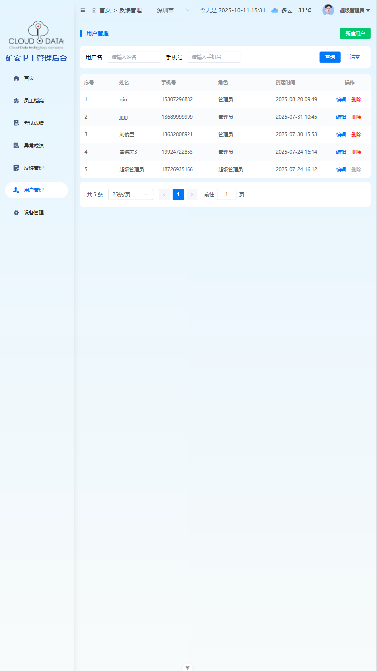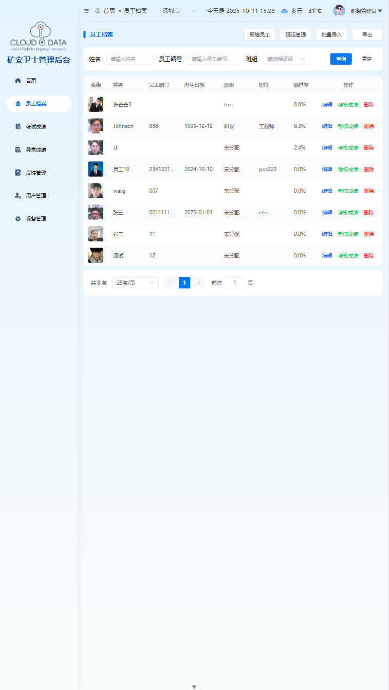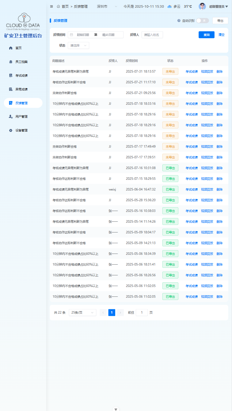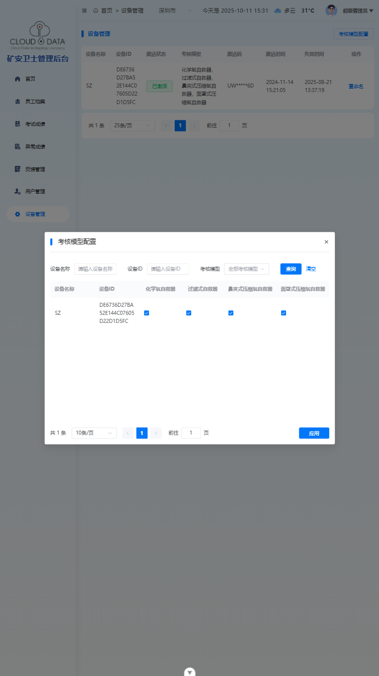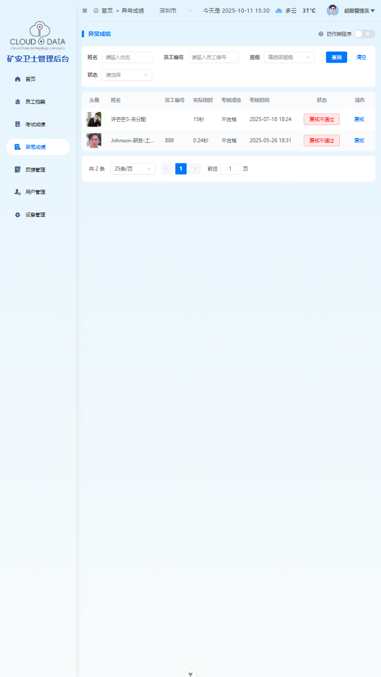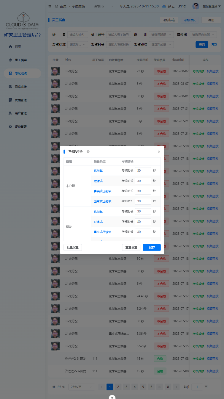 考核系统支持矿工人脸识别考试,判定四种自救器操作合格性,提供视频培训与实时判分的模拟考核;管理后台可管理员工档案与子管理员,查看考试成绩及录像、复核异常与反馈、设置考试参数、管理自救器类型,实现考核全流程数字化管控。