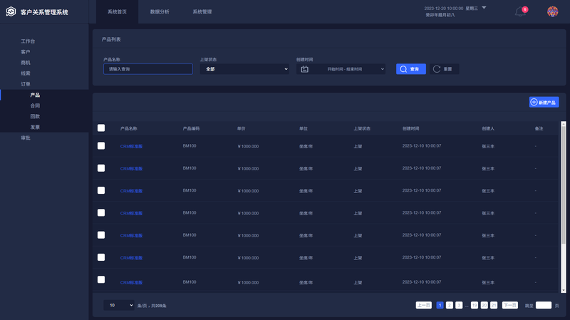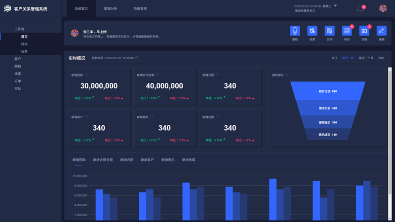 数据分析与报表模块:高管驾驶舱: 为管理者提供一站式数据看板,核心KPI一目了然,包括:业绩达成率、销售漏斗转化率、团队/个人排行榜、客户增长趋势等;自定义报表: 支持按时间、部门、产品等多个维度灵活生成业务报表,如“销售业绩统计表”、“客户来源分析报表”等,满足个性化分析需求。