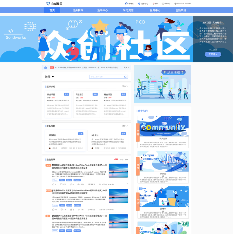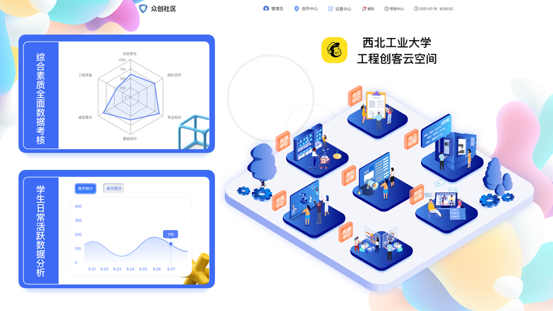 项目分为三个端口,分别是用户pc端,用户小程序端与管理员pc端。用户端包含学生与老师角色,有任务挑战,活动中心,创新项目,学习资源,人物画像,成绩雷达分析等;管理端有设备资源管理,任务管理,课程材料资源,校企协作等功能