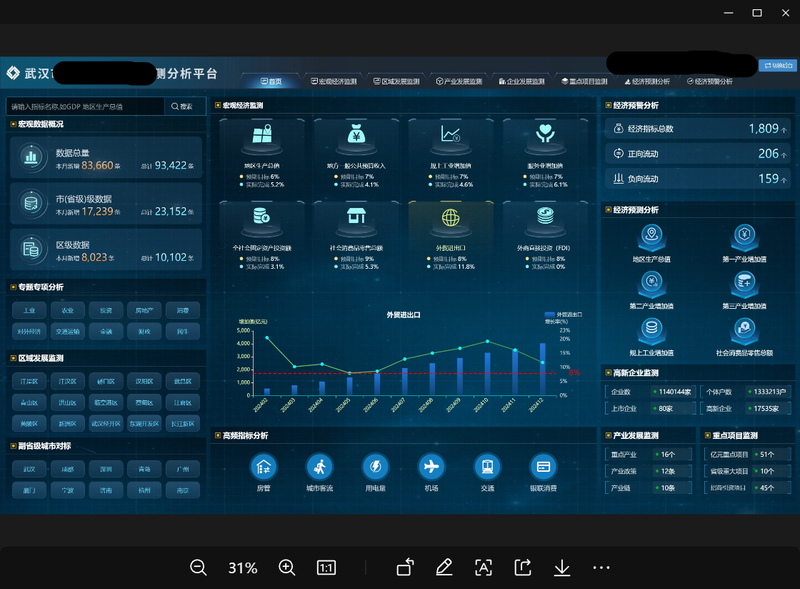 武汉市经济运行监测分析平台主要从宏观经济监测、经济专题分析、经济决策分析、中观产业发展监测以及微观企业发展监测多层面入手,基于云上的信创环境,统一收集汇聚统计局、发改委、科技创新局、经信局、财政局、商务局、税务局等经济主管部门的数据信息,银行、地铁、高速、机场、供电公司、商场等高频数据信息,重点企业、重点项目等实时动态信息,综合应用于分析决策。通过大屏、移动端等形式进行展示分析,从而为武汉市各级政府进行经济运行相关诊断、研究、分析、预测、预警、运行监测提供决策辅助支持,提高决策能力。