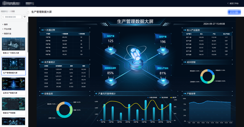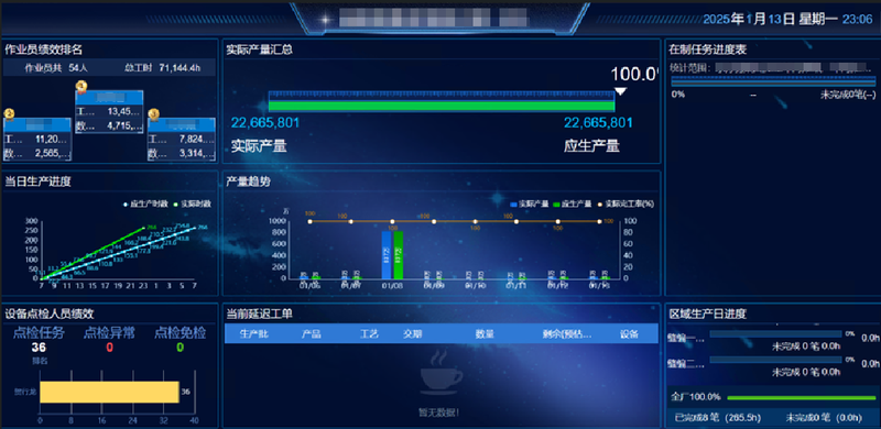 2、效率核心指标:动态展示关键指标如 OEE(设备综合效率)、产量达成率、合格率,让生产效率与质量水平一目了然;