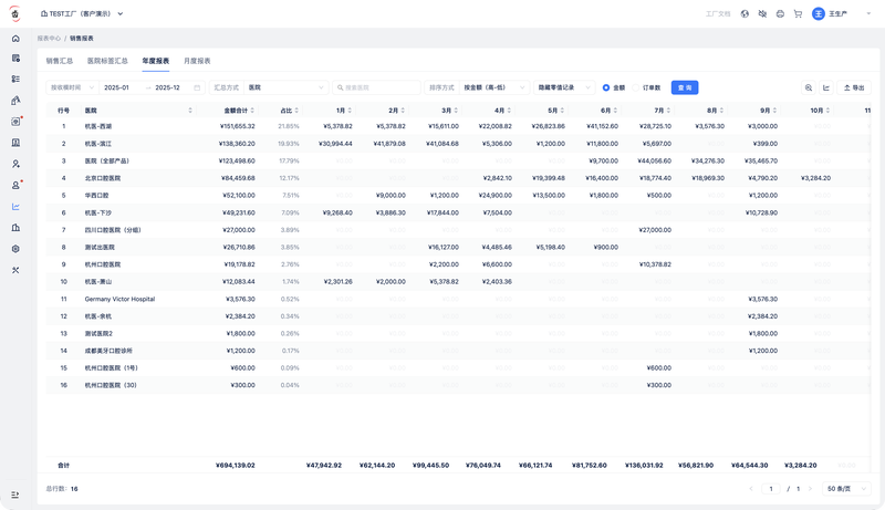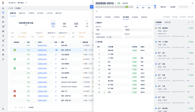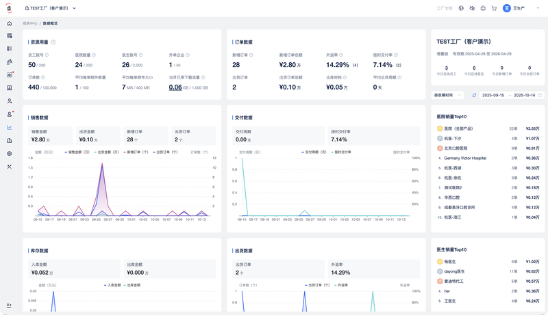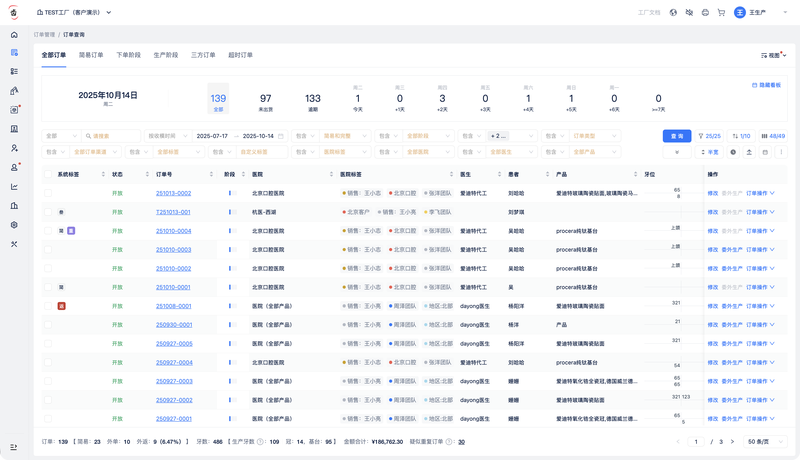 2、主要功能:实现了「门诊下单 -> 工厂接单 -> 生产管理 -> 交付对账」的义齿工厂业务全流程管理,并依据药监局体系规范,自动生成可追溯的生产记录,提供面向义齿设计与生产场景的专业ERP软件功能。