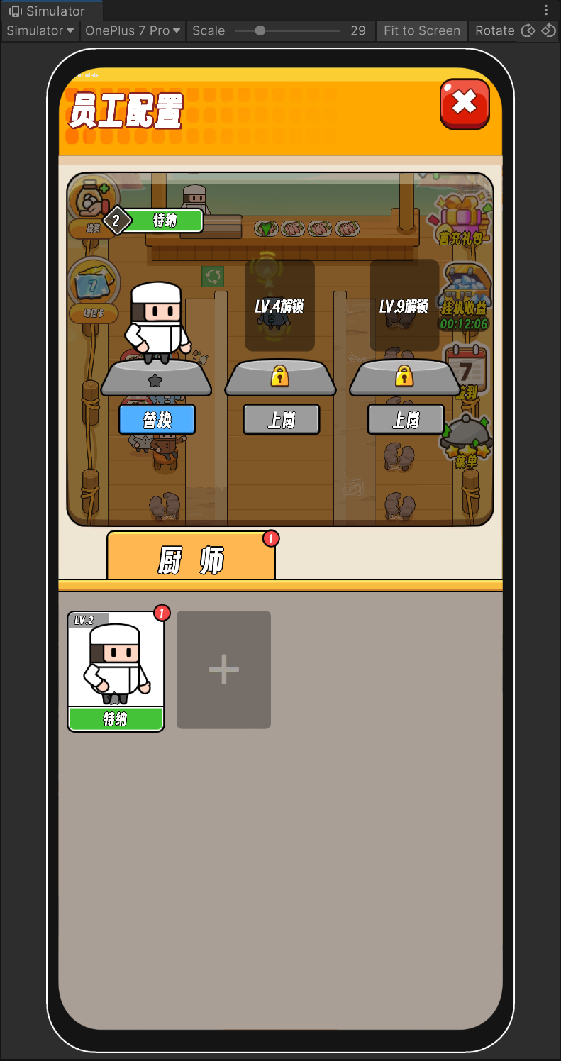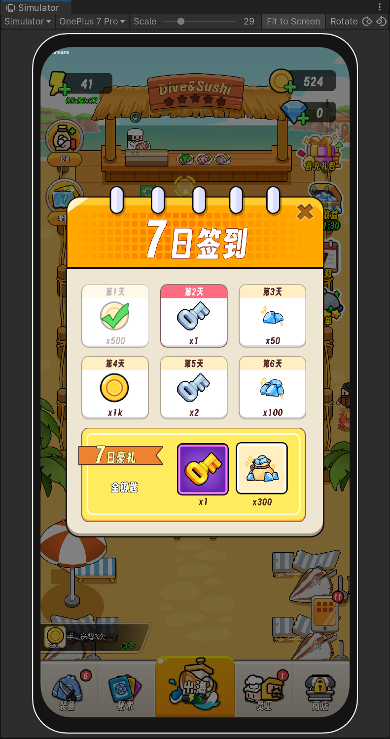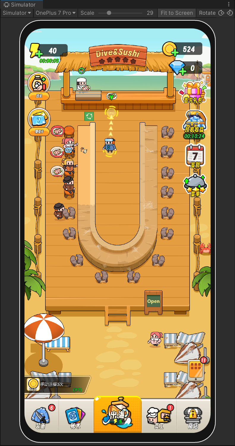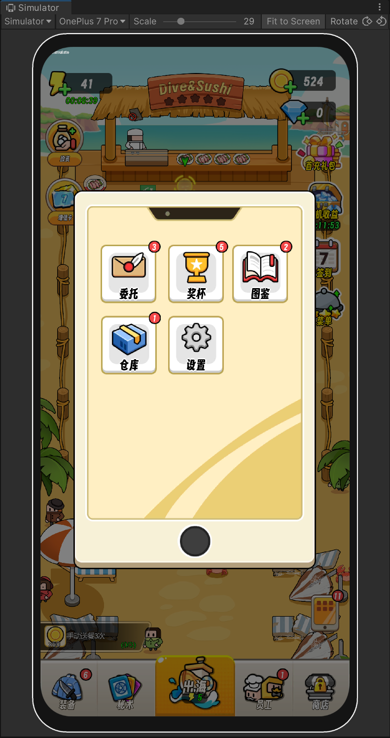 2.我主要负责岸上模拟经营这一部分的所有内容与游戏大部分商业化模块的开发;具体的系统模块有,UI框架,AI角色寻路,角色养成系统,技能系统(AI角色技能),建筑解锁与升级模块,商业化模块(如游戏礼包,游戏抽卡系统,游戏签到等),游戏任务系统,游戏成就与图鉴系统,红点系统,新手引导等。