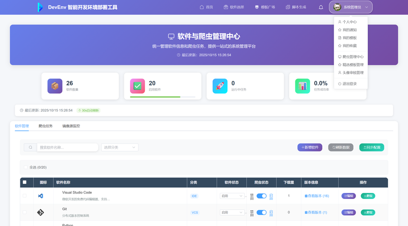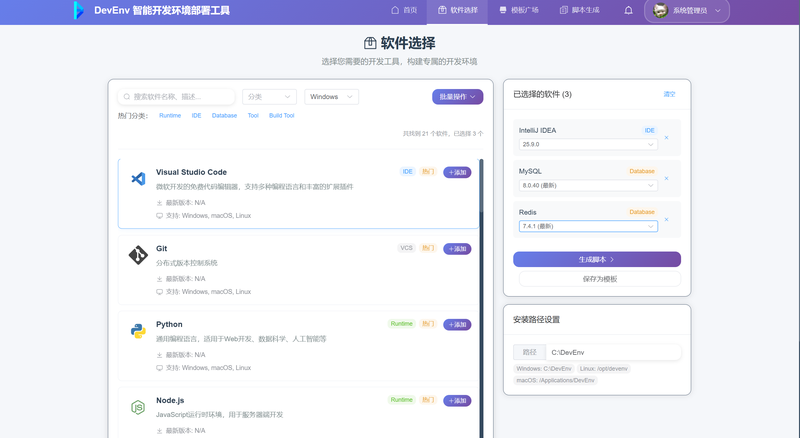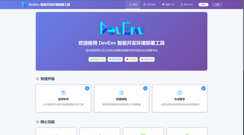 面向高校师生及企业培训场景的智能开发环境自动化部署平台,通过轻量化实时下载与自动化脚本生成技术,实现开发工具链(JDK、IDEA、MySQL 等)的一键部署、环境配置与模板共享,核心解决开发环境部署耗时久、配置冲突率高、教学场景适配性不足等问题。