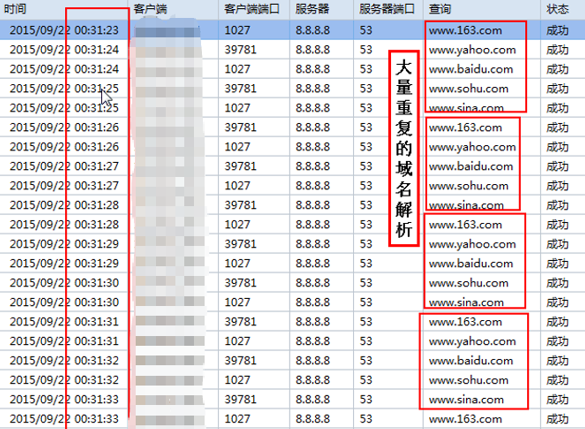 以攻击 8.8.8.8 为例:2015 年 9 月 24 日某时段,单 PC(如 10.168.1.7)通过多端口高频查询,部分请求返回 “域名不存在” 仍持续发起,致 DNS 服务器面临堆栈溢出风险。