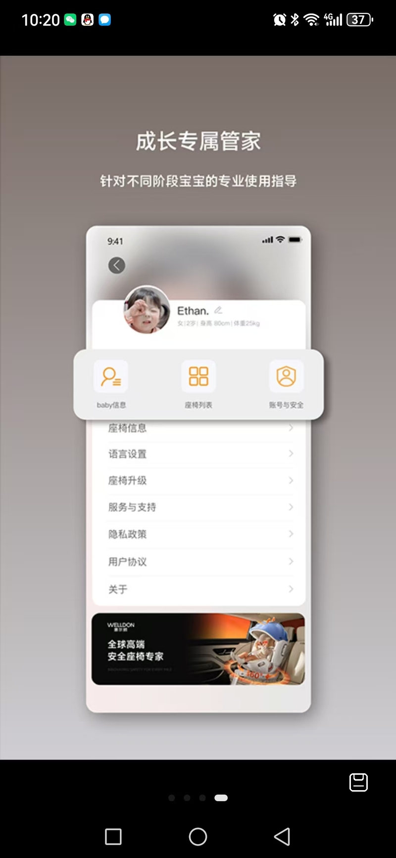 - **快速添加座椅**:用户可以通过app快速添加安全座椅设备,实现与安全座椅的蓝牙智能连接,首次绑定后,每次打开app,系统将自动连接。