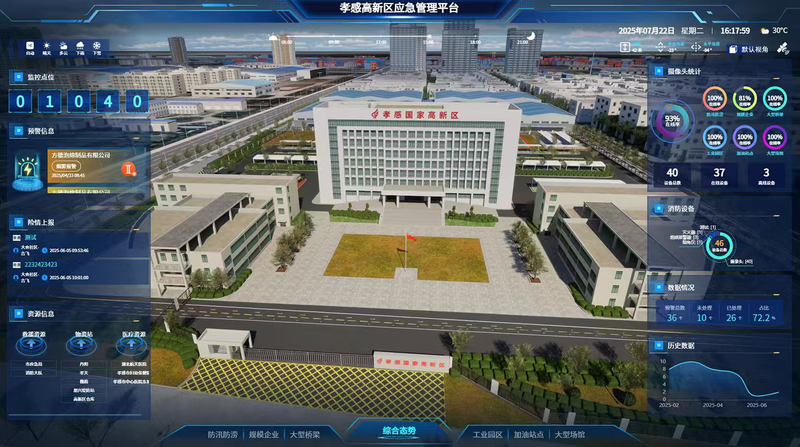 孝感高新区应急智慧平台旨在通过数字化手段提升高新区的应急管理能力,实现对各类突发事件的快速响应、高效处置和科学决策。平台基于 UE 构建了高精度的数字孪生模型,将高新区的地理信息、基础设施、建筑分布等要素进行了全面数字化呈现,为应急管理提供了一个直观、可视化的操作环境