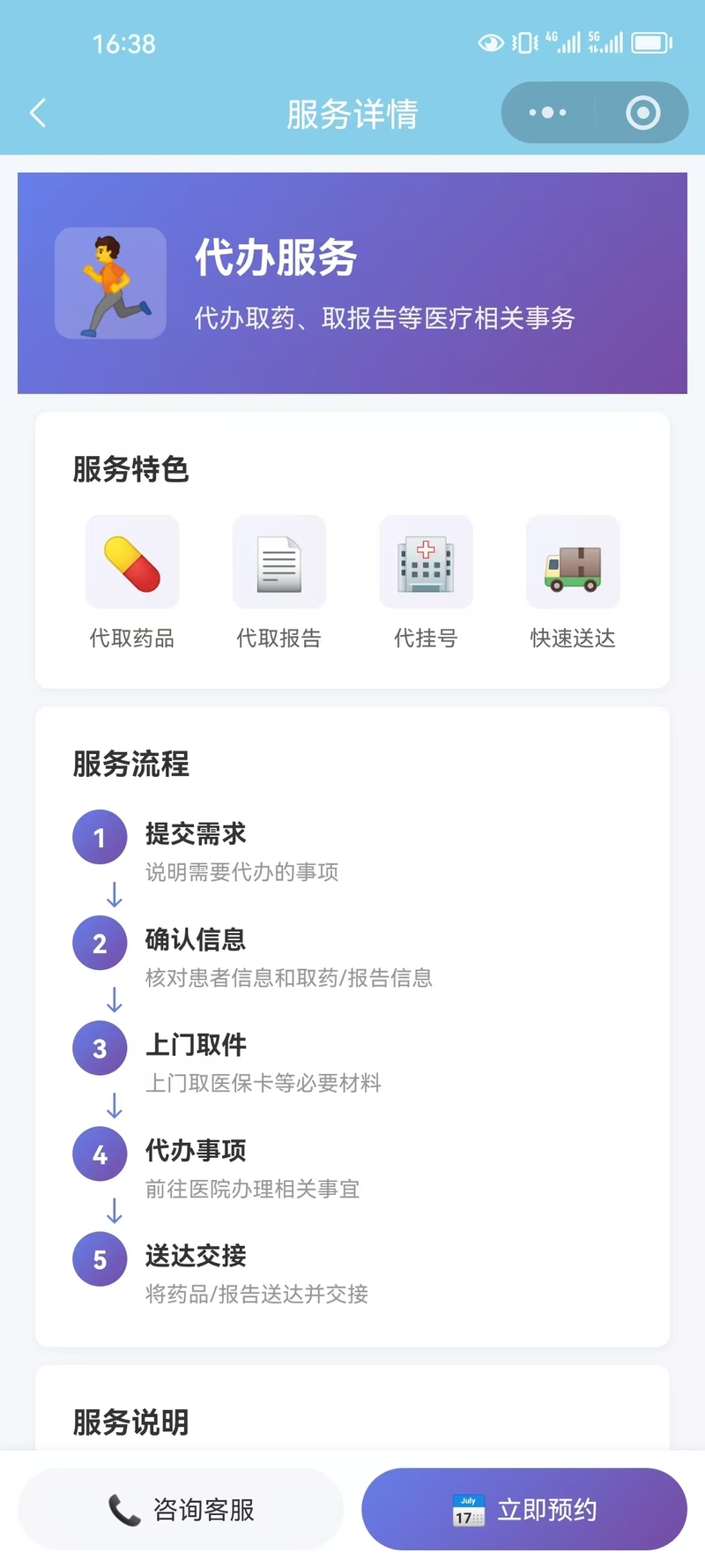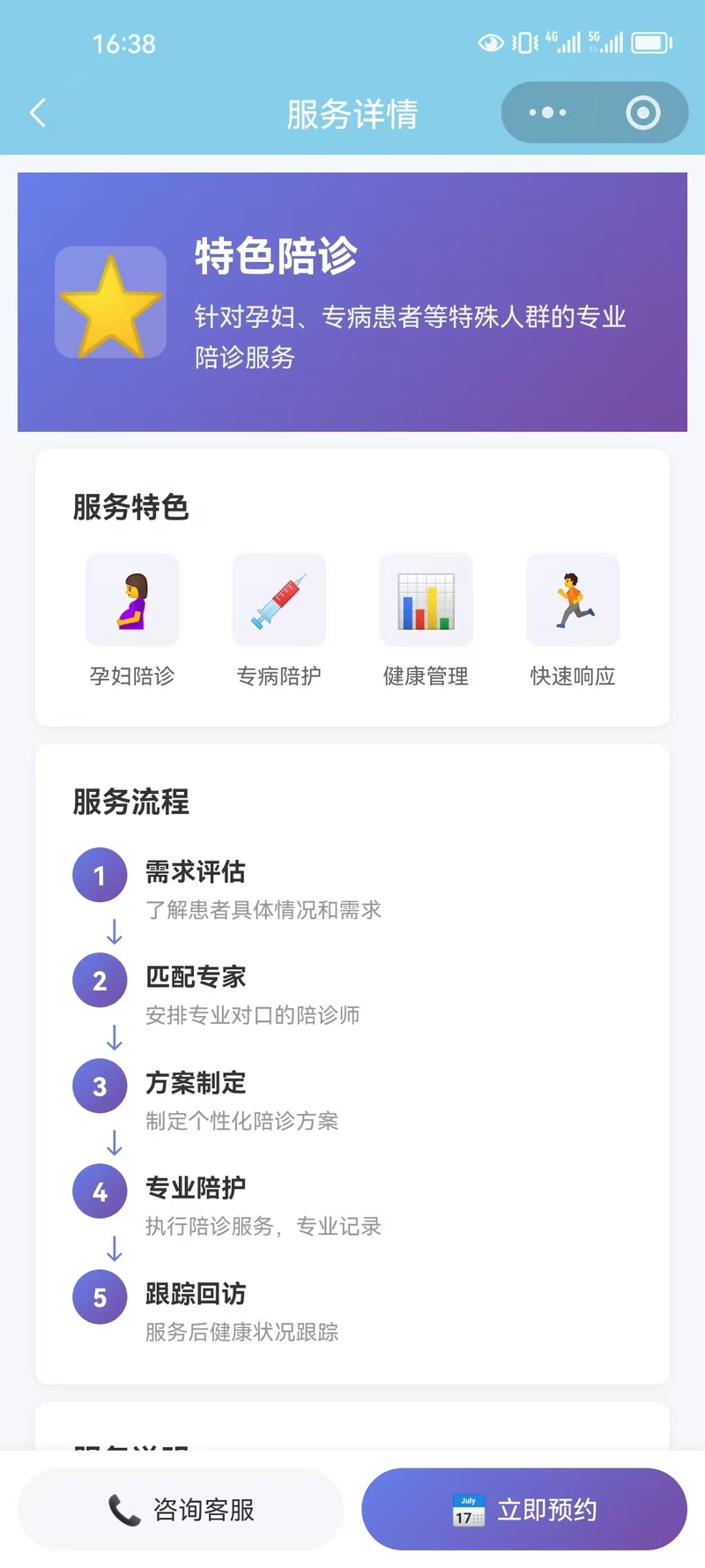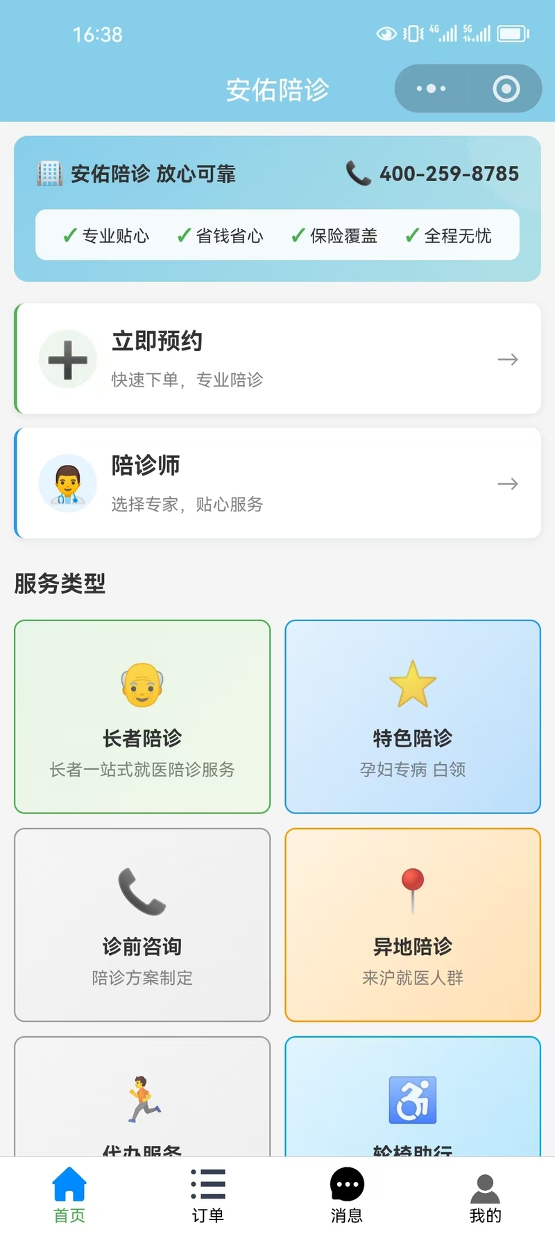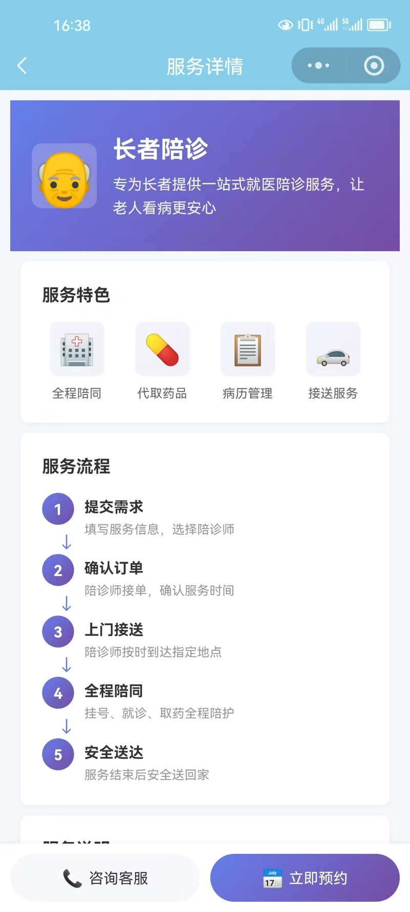 2.功能描述:用户端可以预约各类陪诊服务,如长者陪诊,异地陪诊,待办服务等,查看陪诊师及医院信息,查看订单及消息功能。
