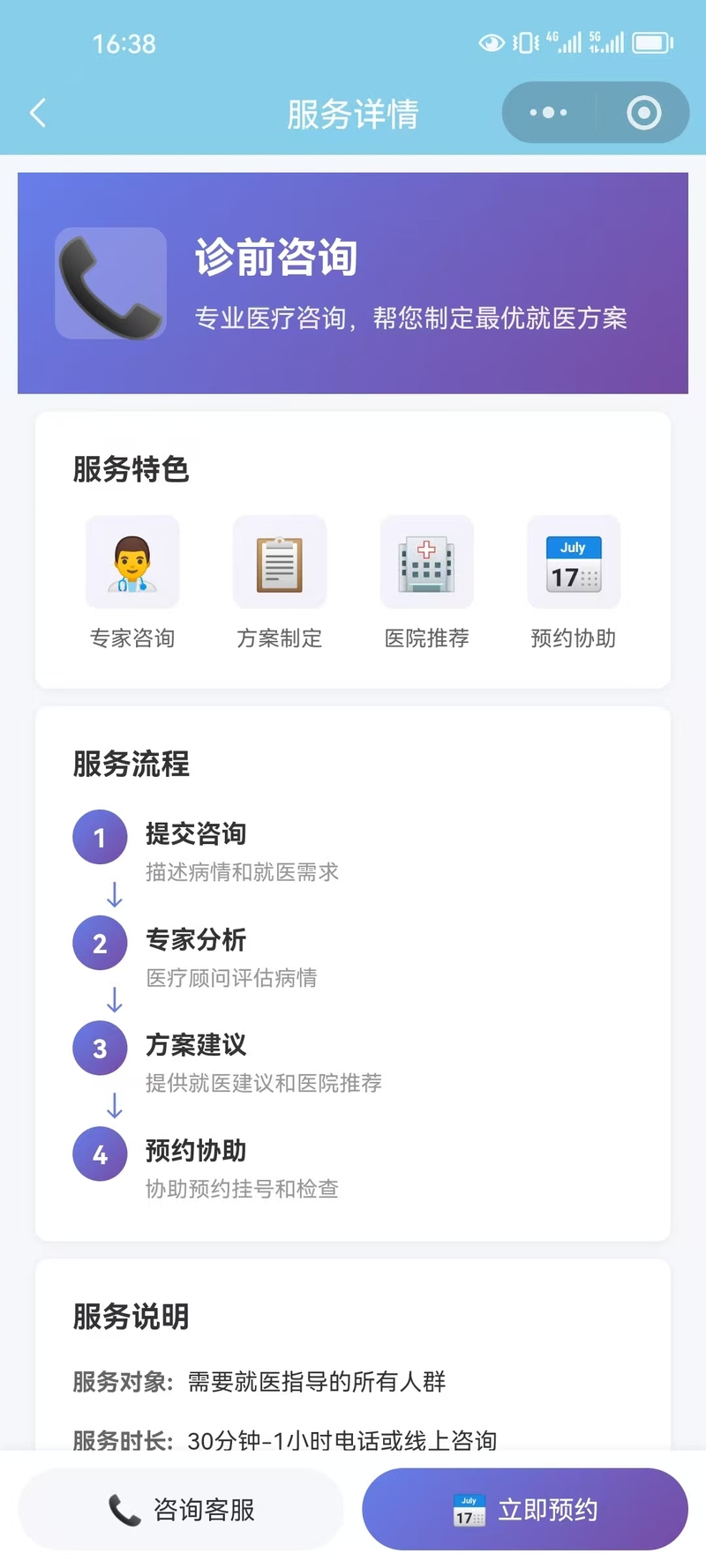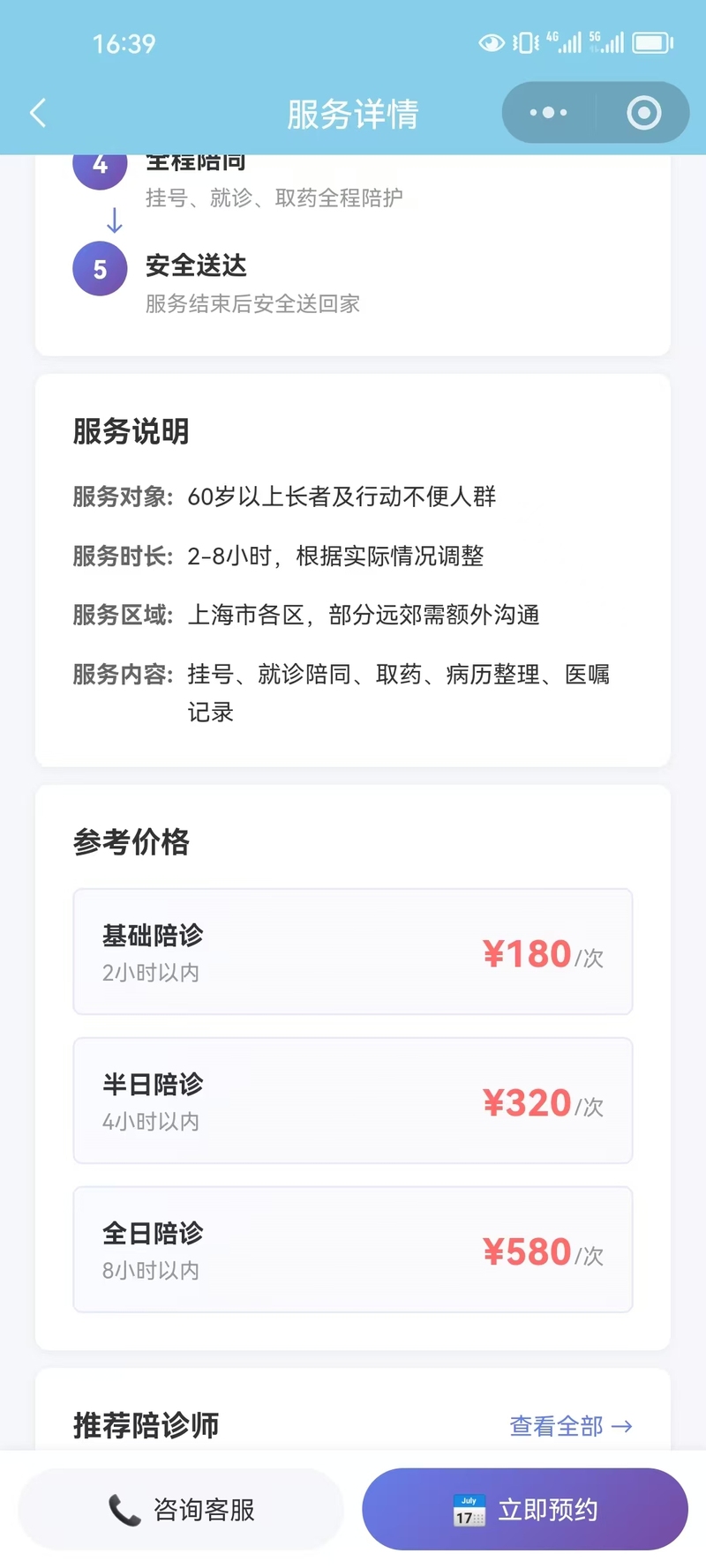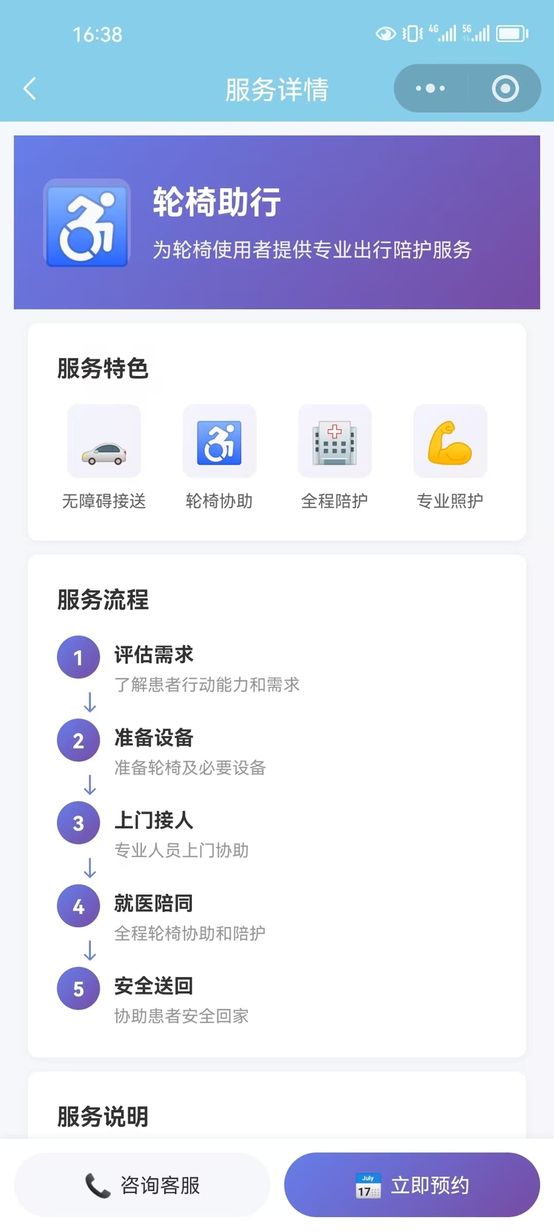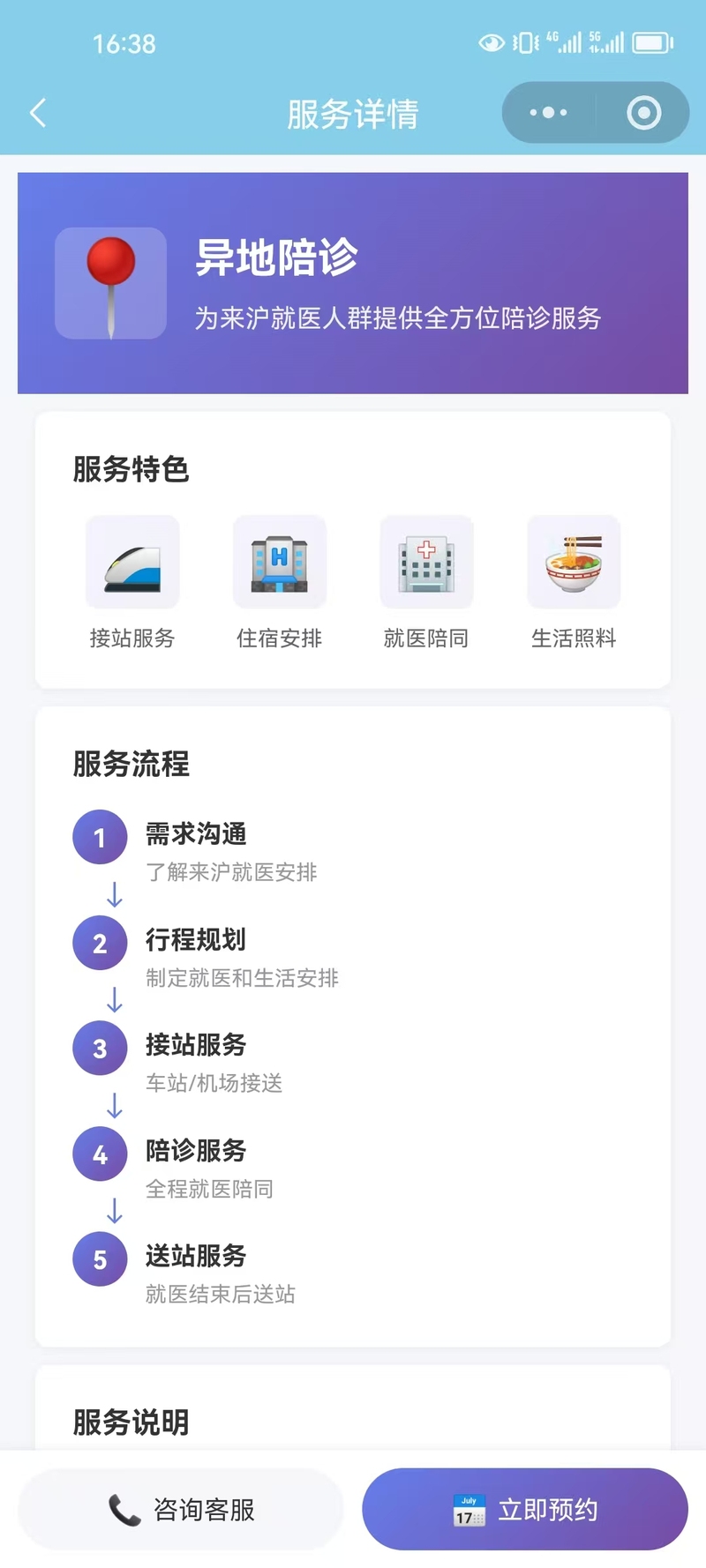 2.功能描述:用户端可以预约各类陪诊服务,如长者陪诊,异地陪诊,待办服务等,查看陪诊师及医院信息,查看订单及消息功能。