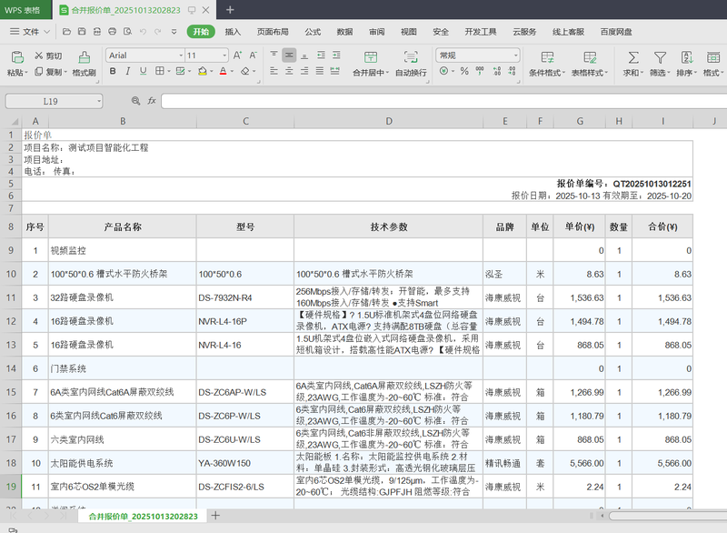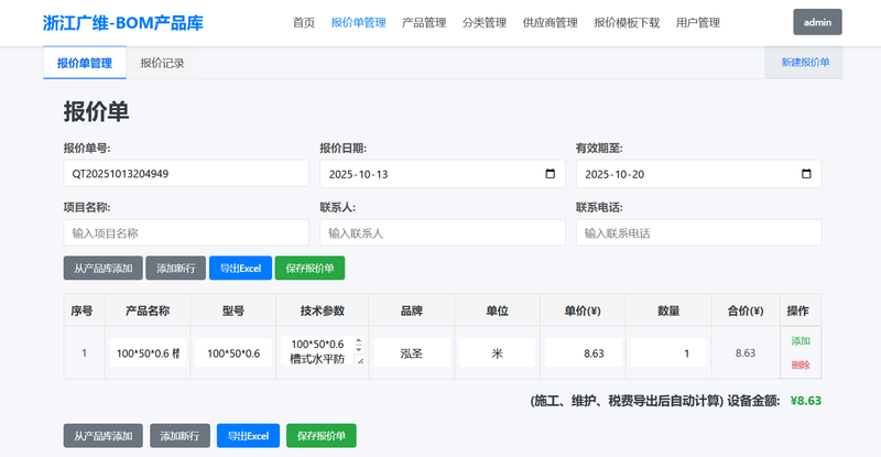 自动计算:自动计算安装调试费(总价 20%)、维护费(总价 + 安装费的 5%)、税费(普通报价 9%/ 成本报价 0%)及项目总计