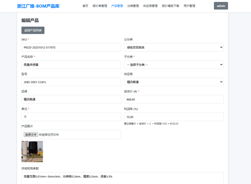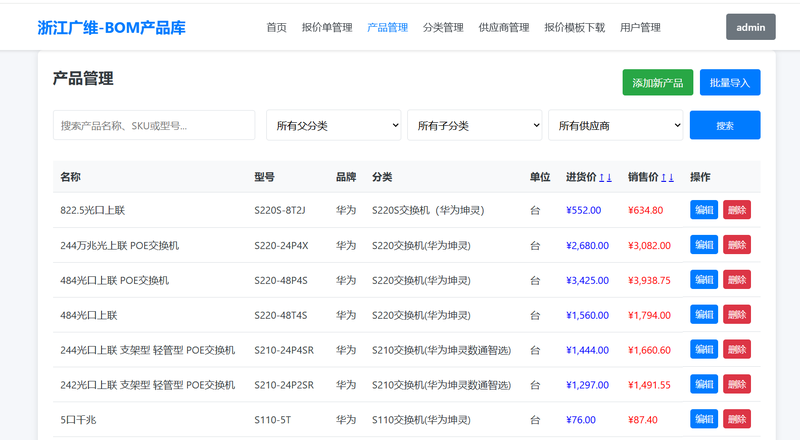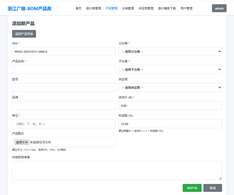 基础信息维护:支持添加 / 编辑产品(add_product.php、edit_product.php),包含 SKU、名称、型号、品牌、分类、供应商、进货价、利润率、规格参数等信息;