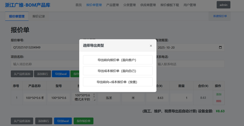 报价单生成:从产品库选择产品(quotation.php中 “从产品库添加” 功能),手动录入数量后自动计算单项总价;